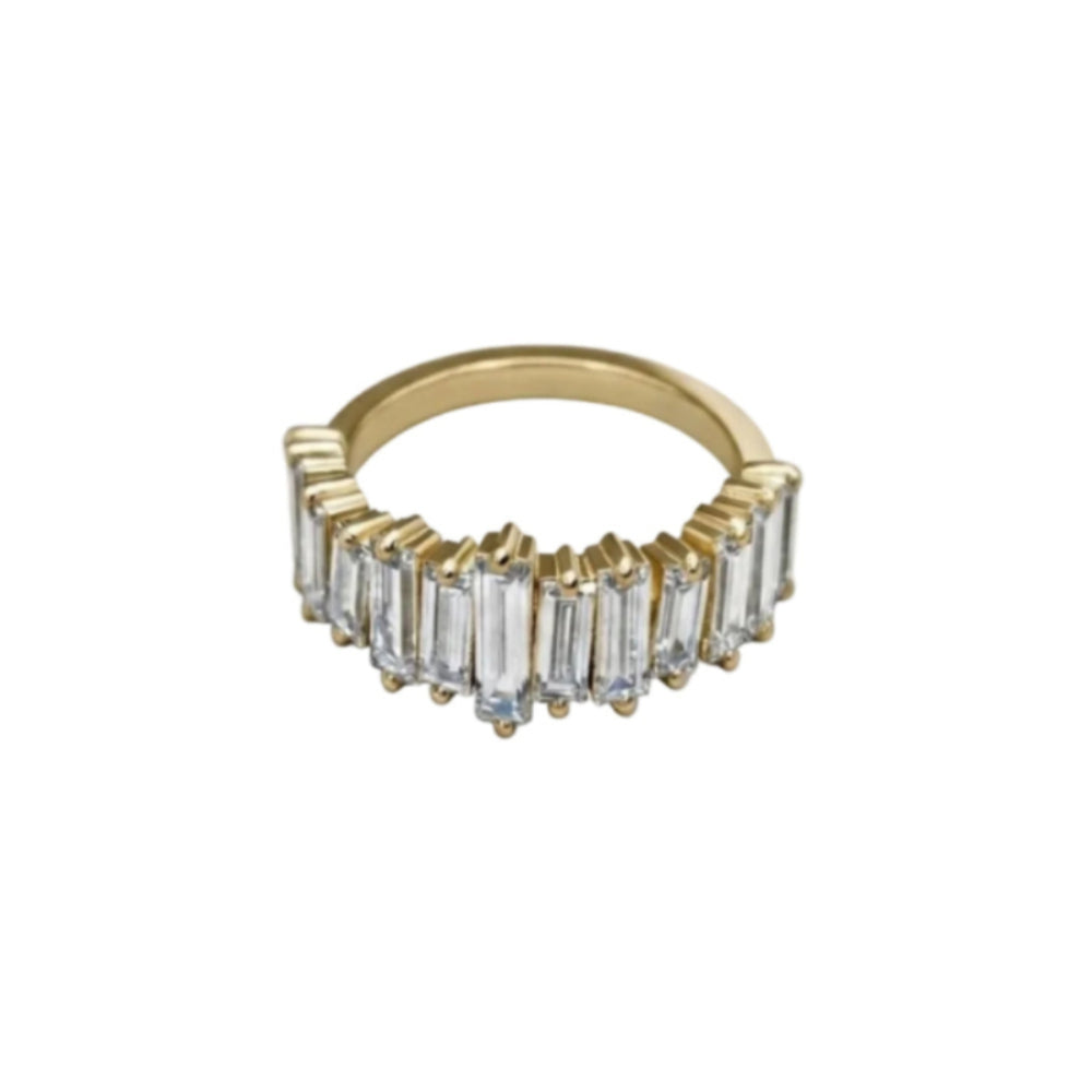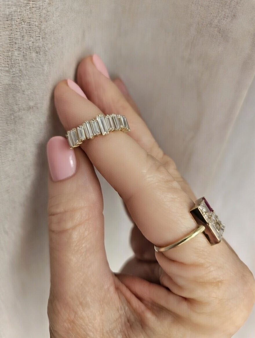 it is made of 14K gold and has 13 lab baguettes in 4 different sizes.
