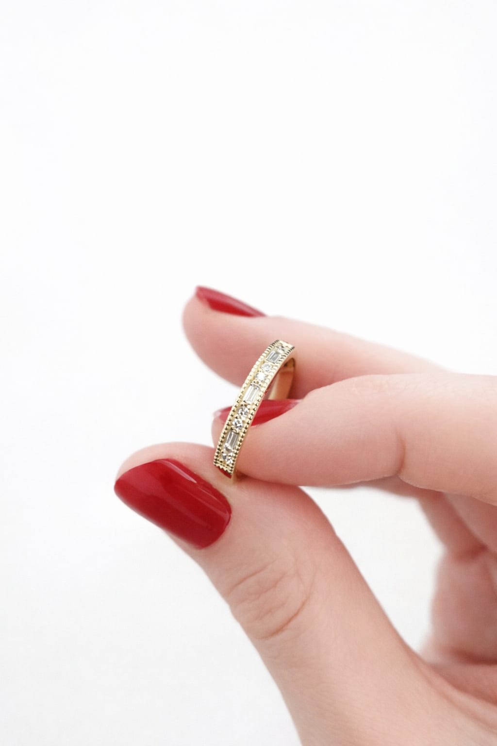 14k gold half-set ring with round and baguettes lab diamonds.